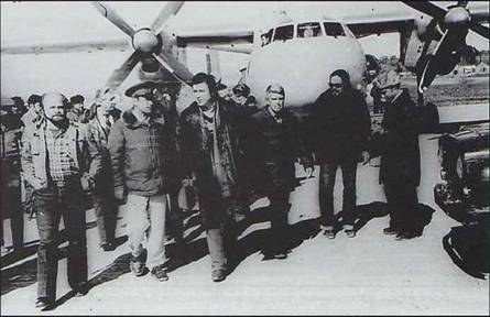 Ан-26 доставил в Джелалобад певца Льва Лещенко. Рядом с ним командир здешнего 335-го вертолетного полка полковник Бесхмельнов