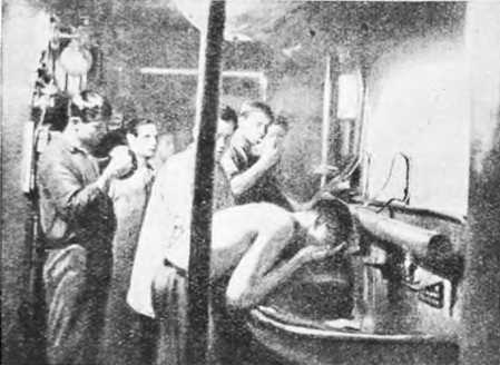 Для мытья тела на кораблях устраивают умывальники по расчету 1 сосок умывальника на 15 человек, души, ванны и бани. Краснофлотцы тех специальностей, при которых неизбежно происходит особенно сильное загрязнение тела и рабочего платья, получают увеличенное количество мыла. То же самое относится и к командам судов, которые производят работу по тралению[17] мин заграждения[18].