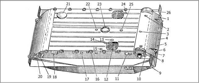 1 — нижний кормовой лист; 2 — пробка лючка для слива масла из внутреннего редуктора; 3 — пробка лючка для слива масла из коробки передач; 4 — верхний кормовой лист; 5 — упор, ограничивающий открывание заслонки; 6 — ограничитель; 7 — отверстие для установки трубы водометного движителя; 8 — пробка сливного отверстия бортовой передачи; 9 — буксирные задние крюки; 10, 20 — отбойные кулаки; 11, 18 — фланцы для установки гидравлических амортизаторов; 12 — приемный люк для забора воды водометным движителем; 13 — пробка лючка для слива масла из бака; 14 — пробка лючка для слива топлива из большого бака; 15 — пробка лючка для слива топлива из малого бака; 16 — кронштейн оси балансира; 17 — кронштейн для резиновых и пружинных упоров; 19 — кронштейн кривошипа направляющего колеса; 21 — крышка люка запасного выхода; 22 — отверстие для слива охлаждающей жидкости из системы охлаждения и воды из корпуса эжектора; 23 — крышка люка под двигателем; 24 — пробка лючка для выемки шлицованного станка шестого торсиона; 25 — пробка лючка для слива масла из картера двигателя; 26 — пробка контрольного отверстия.