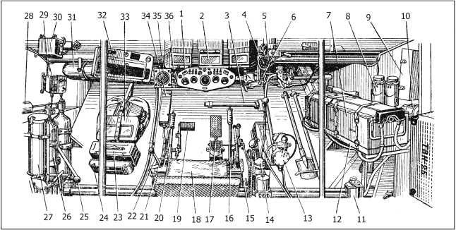 1 — центральный щиток; 2 — прибор наблюдения; 3 — кувалда; 4 — спидометр; 5 — механизм открывания и закрывания люка; 6 — рукоятка привода управления волноотражательным щитком; 7 — аккумуляторная батарея; 8 — бачок для питьевой воды; 9 — ящик приборов наблюдения; 10 — реле стартера; 11 — выключатель аккумуляторных батарей; 12 — аккумуляторная рама; 13 — ручной топливоподкачивающий насос; 14 — кулиса; 15, 21 — рычаги управления заслонками водометного движителя; 16, 20 — рычаги управления бортовыми фрикционами и тормозами; 17 — педаль подачи топлива; 18 — сиденье механика-водителя; 19 — педаль главного фрикциона; 22 — рычаг управления муфтой внутреннего редуктора; 23 — ящик для инструмента; 24 — ящик для гранат; 25 — рычаг управления приводом дроссельной заслонки эжектора; 26 — баллон /7/70; 27 — шприц-пресс; 28 — преобразователь гирополукомпаса; 29 — автомат /7/70, 30 — блок питания ТВН-2Б; 31 — баллон со сжатым воздухом; 32 — распределительный щиток; 33 — защитный колпак механика-водителя; 34 — ящик ЗИП электрооборудования; 35 — гирополукомпас; 36 — ключ для натяжения гусениц.