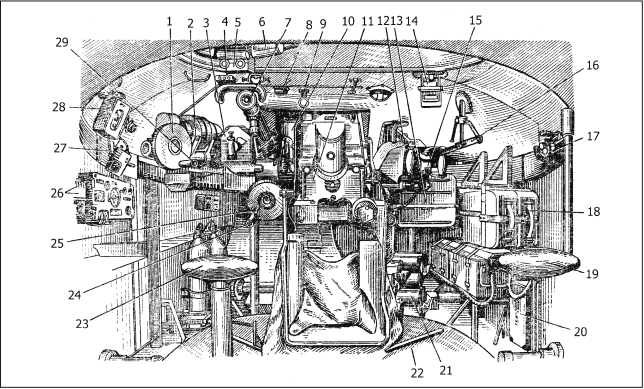 1 — механизм поворота башни; 2 — электродвигатель поворота башни; 3 — контроллер; 4 — сигнальный пульт; 5 — прибор наблюдения ТПКУ-2; 6 — прибор наблюдения ТИП; 7 — прицел TШK-66; 8 — освещение уровня; 9 — стопор крышки люка башни; 10 — реле электроспуска пушки; 11 — пушка; 12, 18 — укладка патронных коробок; 13 — прибор наблюдения МК-4; 14 — пулемет СГМТ; 15 — реле электроспуска пулемета; 16 — рукоятка привода поворотной фары; 17 — стопор башни; 19 — сиденье заряжающего; 20 — укладочный ящик ТВН-2Б; 21 — боеукпадка; 22 — вращающийся пол и к; 23 — сиденье командира танка; 24 — подъемный механизм пушки; 25 — кнопка электроспуска пушки; 26 — радиостанция; 27 — блок настройки антенны; 28 — аппарат ТПУ А-1; 29 — кнопка электроспуска пулемета.