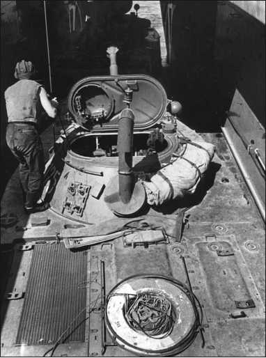 Танки готовятся покинуть десантный корабль. Краснознаменный Черноморский флот, 1966 год. Машины морской пехоты оснащались снаряжением, специфичным только для этого рода войск. Кроме аварийного буя (в сетке сразу за башней) на крыше МТО крепился спасательный круг. На вытяжной вентилятор башни ставилась воздухоотводящая труба, к которой крепился ходовой огонь.