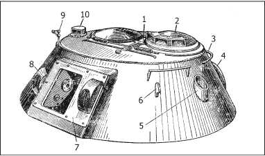 1 — крышка люка башни; 2 — командирская башенка; 3 — поручень; 4 — колпак вентилятора; 5 — стакан антенного основания; 6 — крюк для подъема башни; 7 — рамка пушки; 8 — амбразура; 9 — кронштейн фары; 10 — наружная часть установки призменного перископического прибора заряжающего.