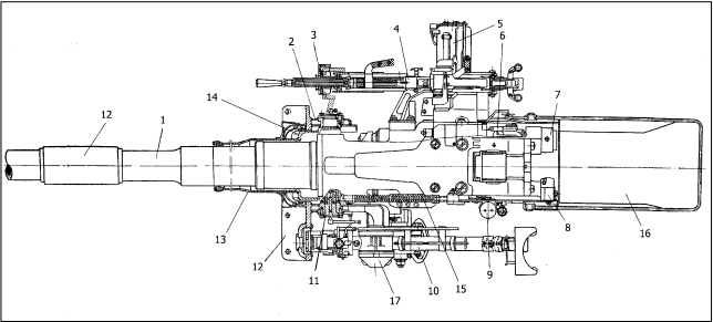 1 — ствол; 2 — щека рамки; 3 — броневая защита пулемета; 4 — пулемет СГМТ; 5 — магазин-коробка; 6 — рукоятка клина затвора; 7 — тормоз отката; 8 — накатник; 9 — электромагнит ЭМ-1; 10 — прицел TШK-66; 11 — левая цапфа пушки; 12 — рамка; 13 — кожух; 14 — броневая маска; 15 — компенсирующий механизм; 16 — гильзоулавливатель; 17 — подъемный механизм; 18 — эжектор.