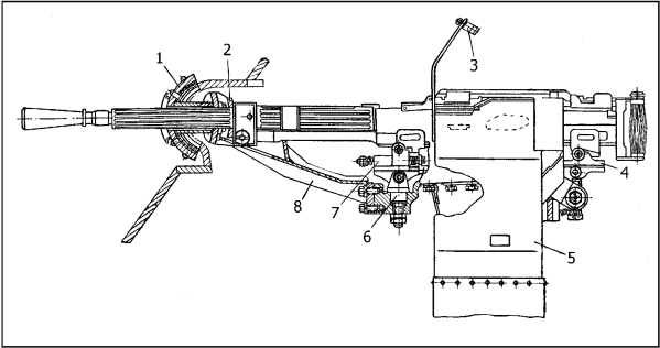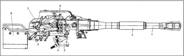 1 — ствол; 2 — эжектор; 3 — гироблок; 4 — подъемный механизм; 5 — прибор автоблокировки; 6 — исполнительный цилиндр; 7 — ограждение пушки; 8 — гильзоулавливатель.
