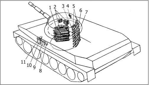 1 — укладка на 24 выстрела; 2 — магазинкоробки для спаренного пулемета; 3 — ящик с гранатами Ф-1; 4 — кобура для сигнального пистолета; 5 — сумка с патронами для сигнального пистолета; 6 — хомутиковая укладка на два выстрела; 7 — укладка на 14 выстрелов; 8 — чехол с автоматом АК-47; 9 — ящик с гранатами Ф-1; 10 — сумка с магазинами к автомату АК-47; 11 — ящик с гранатами Ф-1.