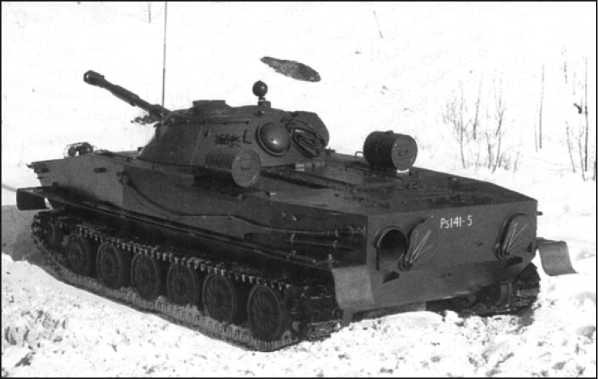 ПТ-76 финской армии. 1964 год. Заслонка левого водомета открыта. На штатных местах установки топливных баков смонтированы баки другого типа с маслом и антифризом. Судя по всему, какая-то финская самодеятельность.