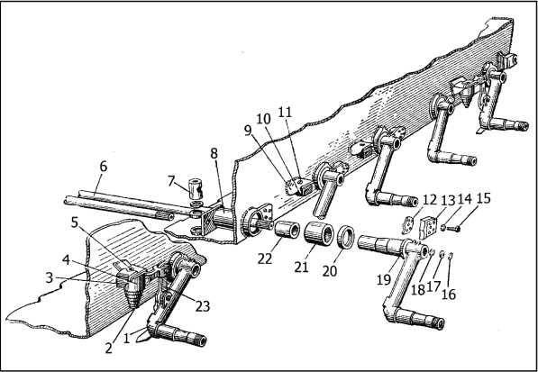 1 — балансир; 2 — боек; 3 — кронштейн; 4 — спиральная пружина; 5 — винт; 6 — торсионный вал; 7 — вкладыш; 8 — кронштейн оси балансира; 9 — кронштейн; 10 — буфер; 11 — винт; 12 — прокладка; 13 — захват; 14 — шайба; 15 — болт; 16 — пружинное кольцо; 17 — крышка; 18 — прокладка; 19 — кольцо лабиринта; 20 — сальниковое уплотнение; 21 — большая втулка; 22 — малая втулка; 23 — тяга амортизатора.