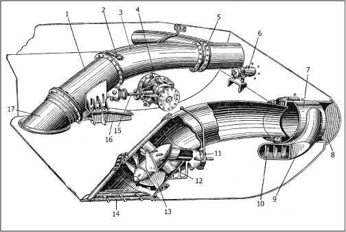 1 — корпус водяного насоса; 2 — трубка для заправки смазки; 3 — водопроточная труба; 4 — внутренний редуктор; 5 — сопловый патрубок; 6 — корпус привода к заслонке; 7 — кормовой патрубок; 8 — заслонка; 9 — труба заднего хода; 10 — броневая перегородка; 11 — картер привода; 12 — лопатки направляющего аппарата; 13 — рабочее колесо; 14 — решетка; 15 — карданный вал; 16 — постамент; 17 — приемный патрубок.