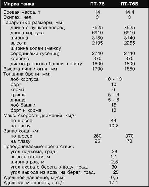 ДВИГАТЕЛЬ И ТРАНСМИССИЯ. На танке ПТ-76 установлен 6-цилиндровый четырехтактный бескомпрессорный рядный дизель жидкостного охлаждения В-6 (варианты В-6Г, В-6П и В-6Г). Максимальная мощность 240 л.с. при 1800 об/мин. Рабочий объем 19 100 см3. Степень сжатия 14–15. Масса двигателя со стартером и маховиком — 815 кг.