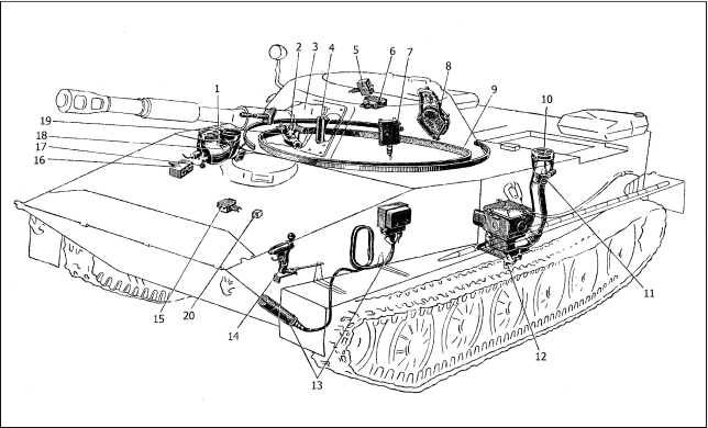 1 — труба выброса отсепарированной пыли; 2 — автоматический стопор башни; 3 — уплотнение амбразуры пушки; 4 — уплотнение амбразуры прицела; 5 — коробка управления стабилизатором; 6 — релейная коробка КРП-1; 7 — радиометрический блок защиты РБЗ-1М; 8 — механизм закрывания окна вентилятора; 9 — уплотнение погона башни; 10 — люк индивидуального воздухопритока двигателя; 11 — механизм закрывания люка воздухопритока двигателя; 12 — сектор привода подвижного уплотнения воздухоочистителя; 13 — рентгенометр ДП-ЗБ; 14 — механизм остановки двигателя; 15 — релейная коробка КРПГ-21; 16 — коробка управления нагнетателем; 17 — механизм закрывания патрубка нагнетателя; 18 — нагнетатель; 19 — люк забора воздуха нагнетателя; 20 — клеммная коробка с диодом Д7Ж (разделительный диод установлен для предотвращения срабатывания системы ПАЗ при срабатывании системы УА ППО).