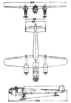 Высота полета, км 0 2 4 Давление наддува, кг/см² 1,1 1.1 1.1 Режим мотора, об/мин 2100 2100 2100 Расход горючего, л/ч 775 775 775 Скорость, км 315 335 365 Общая продолжительность полета, ч 9,45 9,45 9,45 Дальность полета, км 3050 3250 3550* Взлеты производились с бетонированной дорожки.