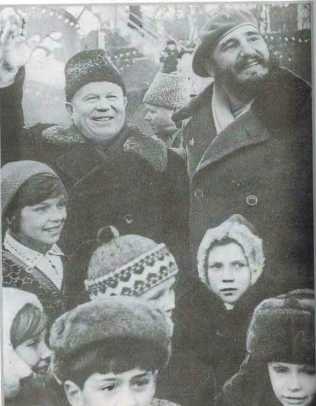 Группа детей приветствует Никиту Хрущева и Фиделя Кастро в кремлевском парке, 1963 г.