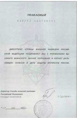 • Пока Сергей занимал должность заместителя резидента СВР, он подготовил по просьбе ФБР подробные биографии более десятка высокопоставленных московских политиков, включая Ельцина и Путина. Да и после его побега, американские спецслужбы не раз обращались к нему за более подробной информацией о высших кремлевских чинах.