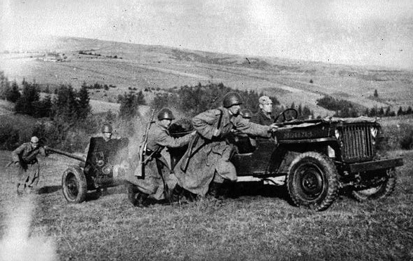 Ну немного скажу о «сорокапятке». В полку было пять батарей по четыре орудия в каждой. Тянули их американские «виллисы», к которым цепляли прицеп, а к нему уже орудие. «Виллис» – замечательная машина, подвижная, мощная, низкая. Ее можно прямо на огневую подогнать. Сама пушка очень хорошая. Прицел с четырехкратным увеличением. Бой очень точный, как у винтовки. На 500 метров в амбразуру промахнуться практически невозможно. Если точно навел, снаряд летит, траекторию не меняет. Конечно, в бою многое зависит от наводчика. У него должны быть очень крепкие нервы. Вокруг него разрывы, пули свистят, рядом раненый товарищ падает на станины, а он должен хладнокровно наводить. Командир взвода в бою находится на полтора метра вправо от орудия, командир орудия – слева.