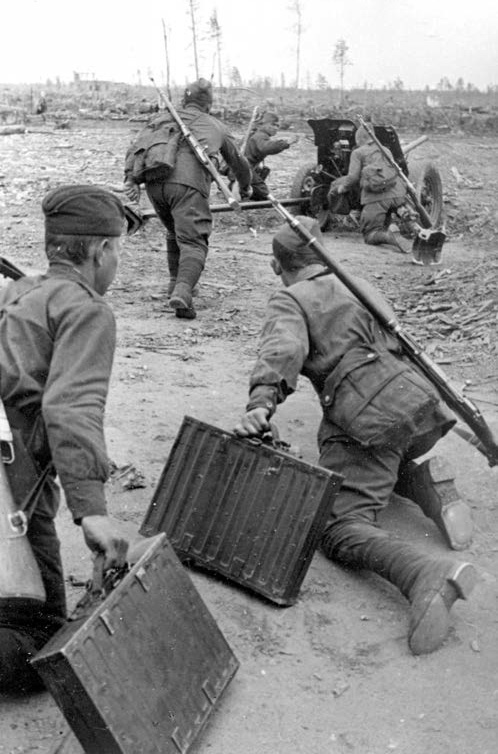 Расчет «сорокапятки» ведет бой в городе. Судя по наличию «сидоров» и отсутствию противогазов фотография сделана в реальной боевой ситуации.