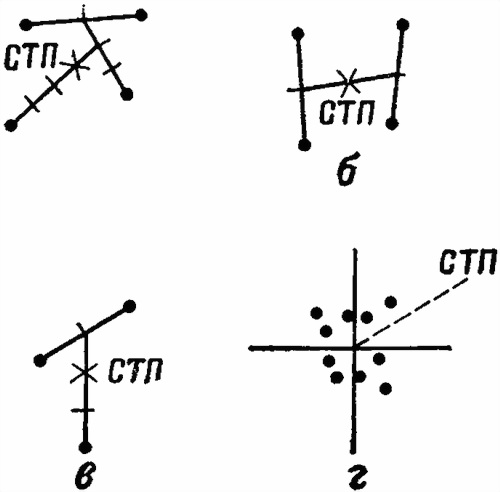 Среднюю точку попадания можно определить также следующим способом: соединить пробоины попарно, затем соединить середины обеих прямых и полученную линию разделить пополам; точка деления и будет средней точкой попадания (рис. 45, б).