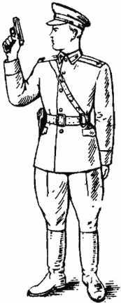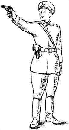 — держать пистолет отвесно дульной частью вверх против правого глаза, сохраняя при этом положение кисти руки на высоте подбородка; левая рука должна быть свободно опущена вдоль тела или заложена за спину;