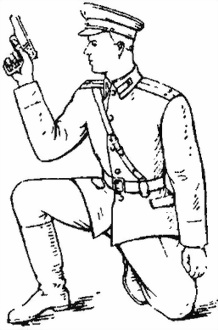 88. Для принятия положения к стрельбе с колена (рис. 55) нужно выставить назад левую ногу так, чтобы носок ступни ее был против каблука правой ноги; быстро опуститься на левое колено и присесть на каблук; правую ногу от колена до ступни держать по возможности отвесно, носок ступни — в направлении на цель; вынуть пистолет из кобуры, выключить предохранитель (опустить флажок вниз); Поставить курок на боевой взвод, если стрельба будет вестись с предварительным взведением курка; удерживать пистолет, как указано в ст. 87.