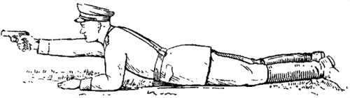 89. Для принятия положения к стрельбе лежа (рис. 56) следует сделать полный шаг правой ногой вперед и немного вправо; наклоняясь вперед, опуститься на левое колено и поставить левую руку на землю впереди себя, пальцами вправо; затем, опираясь последовательно на бедро левой ноги и предплечье левой руки, лечь на левый бок и быстро повернуться на живот, раскинув ноги слегка в стороны носками наружу. Вынуть пистолет из кобуры, выключить предохранитель и поставить курок на боевой взвод, как указано в ст. 87; если стрельба будет вестись самовзводом, то после выключения предохранителя вложить указательный палец правой руки в спусковую скобу, не касаясь спускового крючка.