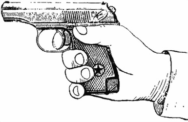 — удерживая пистолет дульной частью вверх, наложить большой палец правой руки на флажок предохранителя и опустить его вниз (выключить предохранитель); вложить указательный палец в спусковую скобу, не касаясь спускового крючка.