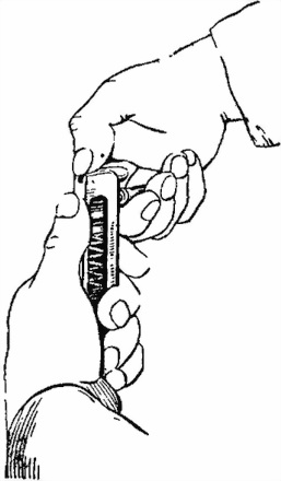 — вынуть патроны из магазина: взяв магазин в левую руку, большим пальцем правой руки сдвинуть патроны один за другим вперед по подавателю магазина и подхватить их ладонью той же руки (рис. 59);