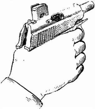 90. Для производства выстрела из всех положений для стрельбы надо: выбрать точку прицеливания; не прекращая наблюдения за целью, вытянуть правую руку с пистолетом вперед, удерживая пистолет за рукоятку кистью правой руки; наложить указательный палец этой руки первым суставом на хвост спускового крючка; вытянуть по левой стороне рукоятки большой палец правой руки параллельно направлению ствола (рис. 57); вытянутую правую руку держать свободно, без напряжения, кисть этой руки держать в плоскости, проходящей через ось канала ствола и локоть руки (рис. 58); рукоятку пистолета не сжимать и держать ее по возможности однообразно.