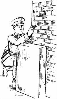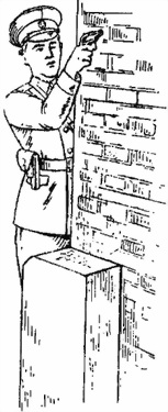 97. Пари стрельбе с руки из-за укрытия следует принять соответствующее положение для стрельбы (стоя, с колена, лежа) и приложить правую руку к упору так, чтобы кисть руки с пистолетом была свободной (рис. 61 и 62).