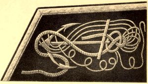 Гребцам других двух шлюпок сверх описанной одежды полагались кафтан и брюки зеленого цвета с золотыми пуговицами, красный камзол, кушаки из двойного стамеда, тафтяные красные галстуки, черные триповые шляпы с алыми лентами и медными вызолоченными гербами, с золотыми кистями и узким золотым же галуном.