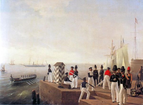 Гвардейский экипаж у пристани в Петергофе. А.И. Ладюрнер.1854 г.