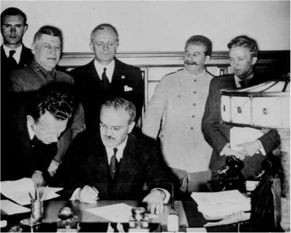 Сговор был выражен, якобы в договоре о ненападении между двумя державами, подписанном в Москве 23 августа 1939 г. министром иностранных дел Германии Иоахимом фон Риббентропом и председателем советского правительства и по совместительству народным комиссаром иностранных дел Вячеславом Михайловичем Молотовым. В историю дипломатии этот договор вошел под нарицательным именем «Пакт Молотова — Риббентропа». Уже сам этот ярлык является манипулятивным, ибо существенно искажает суть соглашения. Сам по себе этот межгосударственный договор не может быть признан враждебным какой-либо третьей стране или преступным, договор о ненападении Германия имела со многими странами, в том числе с Великобританией, Францией, Польшей. Вот текст советско-германского договора, опубликованный в советской прессе 24 августа 1939 г.