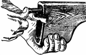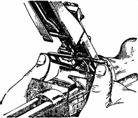 3) Вынуть пенал с принадлежностью. Головкой шомпола или пальцем нажать на защелку крышки затыльника вниз; большим пальцем левой руки повернуть крышку (рис. 3), вынуть пенал с принадлежностью и открыть его.
