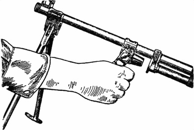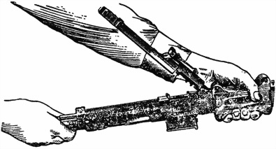 7) Отделить затворную раму. Удерживая пулемет левой рукой за цевье, указательным пальцем правой руки выдвинуть снизу затворную. раму из ствольной коробки назад, затем, обхватив правой рукой затворную раму вместе с затвором (рис. 6), отделить их от ствольной коробки.