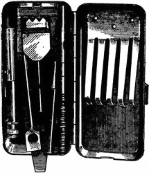 8) Собрать принадлежность. В корпусе пенала уложить ключ регулятора, затем в любом порядке уложить прочистки, извлекатель, выколотку, протирку, ключ мушки и вороток (рис. 7); закрыть крышку пенала и застегнуть застежку. Уложить пенал с принадлежностью в гнездо приклада и закрыть крышку затыльника.
