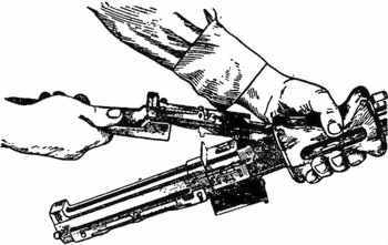 9) Проверить правильность сборки пулемета после неполной разборки, для чего один — два раза взвести и спустить затворную раму с боевого взвода, придерживая при этом рукой затворную раму за рукоятку перезаряжания.