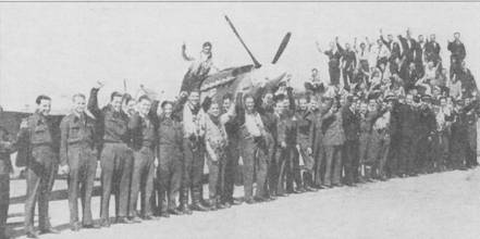 «Одним из самых удачных для нас дней стало 12 марта 1943 г. Большинство из нас встало в 6 часов утра, но некоторые предпочли проспать завтрак в расчете чего-нибудь перехватить на ходу. Как обычно, инструктаж начался в 7 часов. Инструктаж еще не закончился, когда поступил сигнал тревоги – вражеские самолеты приближались к побережью. Солнце только- только взошло. Красные и золотистые блики играли на обшивке истребителей. Это была удивительно красивая картина. Три или четыре самолета уже взлетали курсом на восток, еще четыре рулили на старт, за ними готовилась к старту еще одна четверка. 11 маленьких ураганов! Взлет группы занял всего шесть минут – от запуска двигателя первого самолета и до отрыва от земли крайнего.