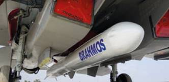 Авиационный Brahmos-A — самая «короткая» и легкая из всех версий этой ракеты (имеются еще версии наземного, корабельного и подводного базирования). Ее длина составляет 8,5 м, а стартовая масса — 2550 кг. Ракета развивает скорость 750 м/с (М=2,5) и имеет дальность пуска до 290 км (при маловысотном пуске — 120 км). После завершения программы испытаний ожидается заказ Минобороны Индии на довооружение «брамосом» примерно четырех-пяти десятков Су-30МКИ индийских ВВС. ПБ.