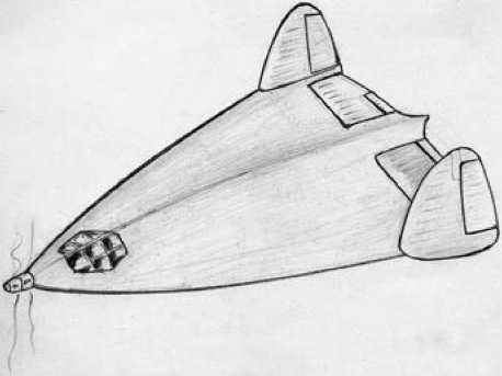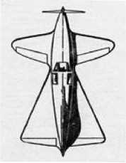 Проект самолёта-автомобиля П.Я. Козлова, 1936 г. Треугольное крыло малого удлинения выбрано автором изобретения из соображений компактности, чтобы на земле можно было перемещаться по обычным автомобильным дорогам.