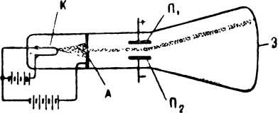 Нагреваемый катод К излучает электроны, которые притягиваются анодом А. Часть прилетевших на анод электронов проскакивает через небольшое отверстие в аноде и продолжает лететь узким пучком дальше. На пути этого узкого электронного пучка ставится стеклянный экран Э, покрытый особым веществом, которое обладает способностью светиться под влиянием ударяющих электронов. Таким образом место падения электронного пучка становится видимым.