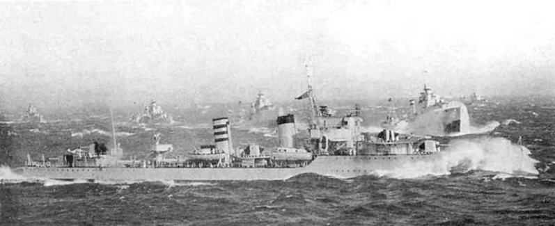 Эскадренные миноносцы "Havant" (вверху) "Hesperus" (в центре) и лидер "Inglefield" во время шторма (внизу)