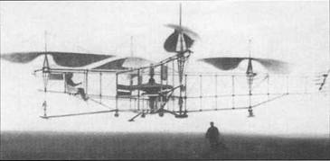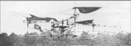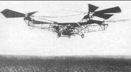 Дальнейший «прорыв» в сторону увеличения продолжительности и дальности полета был достигнут в 1923- 1924 гг. на четырехвинтовом вертолете, разработанном и построенном во Франции инженером автомобильного завода фирмы «Пежо» Этьеном Эми- шеном. В 1920 году он построил первый летательный аппарат, являющийся гибридом геликоптера и аэростата (позже такие аппараты стали называться геликостатами). Аппарат имел ферменный фюзеляж с установленным на нем поршневым двигателем мощностью 25 л.с., приводящим во вращение два двухлопастных несущих винта диаметром 6 м. Винты создавали тягу в 265 кг, а масса аппарата составляла 338 кг, поэтому сверху к нему был прикреплен аэростат объемом 144 м 3 , наполненный водородом. Водород создавал аэростатическую подъемную силу более 70 кг, что позволило совершать полеты на высоте до 1,5 м в течение одной минуты.