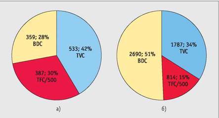 Рис. 1. Структура затрат: а) однодвигательного вертолета со взлетной массой 2 т; б) двухдвигательного вертолета со взлетной массой 8 т