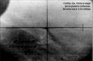Старший лейтенант Алфеев: — …В момент атаки я был атакован самолетом противника Ф-86, по которому вел огонь мой ведомый старший лейтенант Шебанов, и вышел я из атаки вправо вверх и точного места падения не наблюдал. 1*