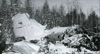 Обломки Ил-14 (СССР-61712) Якутской отдельной авиагруппы. Самолет зацепил деревья при заходе на посадку в результате ошибки экипажа. 31 октября 1961 г.
