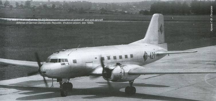 Национальная народная армия ГДР получила 4 «Ила» советского происхождения и еще 24 самолета VEB 11-14 нескольких модификаций, включая Р, Т, PF, S/PS. Машины применялись в летной школе, транспортной эскадрилье TS-27/24, атакже в спецавиагруппе TG-44 (STS-29), занимавшейся VIP-перевозками, причем ее самолеты носили цвета «Интерфлюга» и гражданскую регистрацию. «Илы» выполняли свои традиционные задачи, а дольше всех прослужили «фотографы» – борт 422 выполнил последний полет 17 декабря 1982 г.