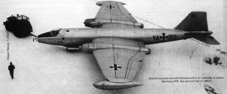 Западная Германия приобрела в 1965 г. три «Канберры» В.2, которые ранее эксплуатировались в RAF (№№ WK130, WK137 и WK138). Изначально немцы намеревались использовать их в исследовательских и испытательных целях. После доработок, выполненных в 1966 г. английской компанией Marshall's of Cambridge, «Канберры» прибыли в Манхинг, где располагается исследовательский центр люфтваффе. По официальной германской версии, самолеты использовали для испытаний новых навигационных, разведывательных систем, а также систем управления оружием. Время от времени «Канберры» привлекались для зондирования атмосферы, изучения погоды и других научных целей. Некоторое время один самолет (№ D9569) использовался Германским аэрокосмическим исследовательским институтом, а остальные – военной географической службой для картографирования местности.