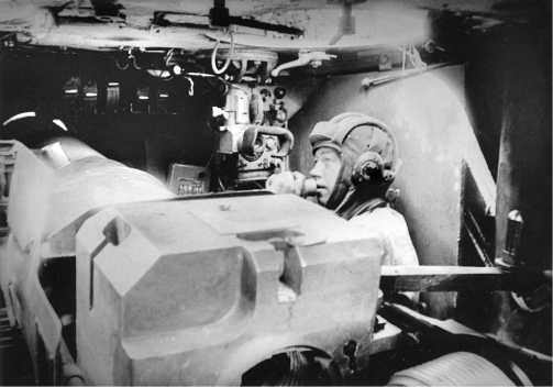 Интерьер самоходной установки СУ-152. На переднем плане — массивная казенная часть 152-мм пушки-гаубицы MЛ-20 с открытым поршневым затвором. За ней, на своем рабочем месте, — командир машины, перед открытым посадочным люком которого установлена панорама ПТК-4. Курская дуга, 6 июля 1943 года.