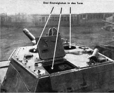 Посадка экипажа производилась через два люка: круглый, расположенный в передней части крыши справа, и прямоугольный двухстворчатый люк, расположенный в кормовой части крыши и кормовом листе рубки. В днище корпуса в боевом отделении был предусмотрен аварийный люк.