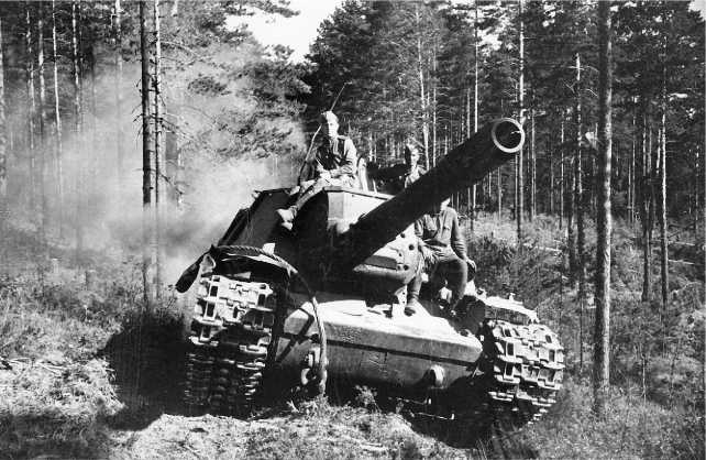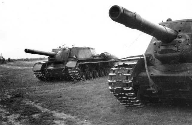 СУ-152 ведет огонь по немецким танкам. 2-й Прибалтийский фронт, лето 1944 года.
