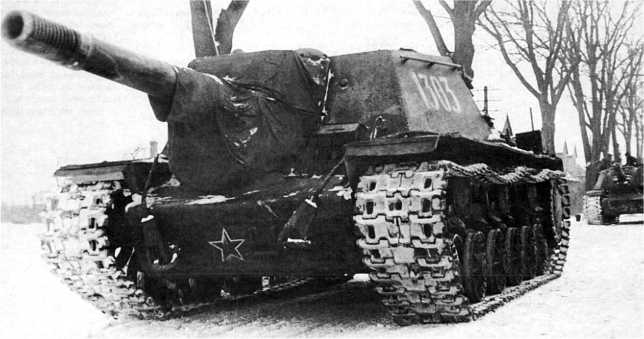 Колонна СУ-152 на дороге в Восточной Пруссии. Февраль 1945 года.